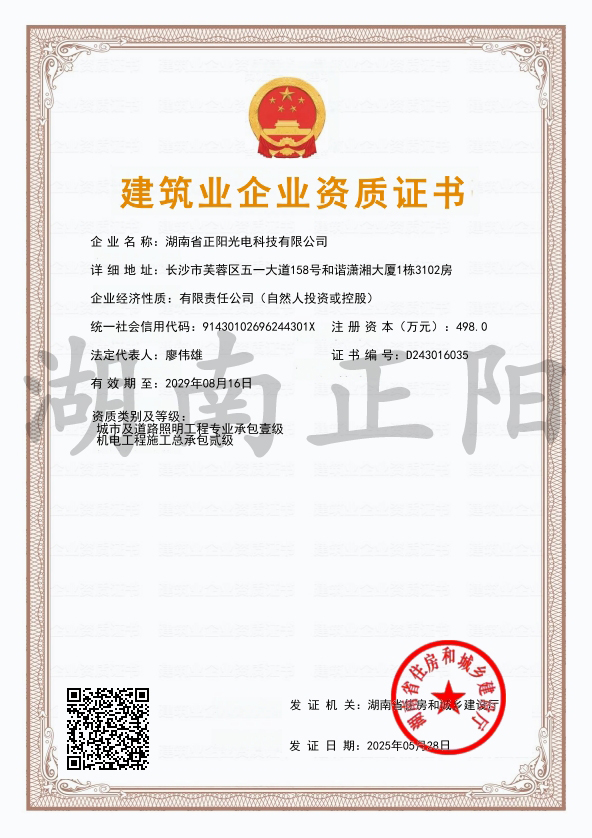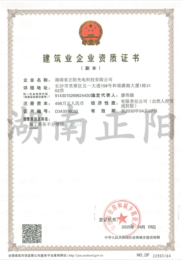 2025年4月8日,經(jīng)長沙市住房(fáng)和城鄉建設局審(shěn)核批準,湖南省正(zhèng)陽(yáng)光(guāng)電科(kē)技有限(xiàn)公司成功獲得“施工勞務”資...