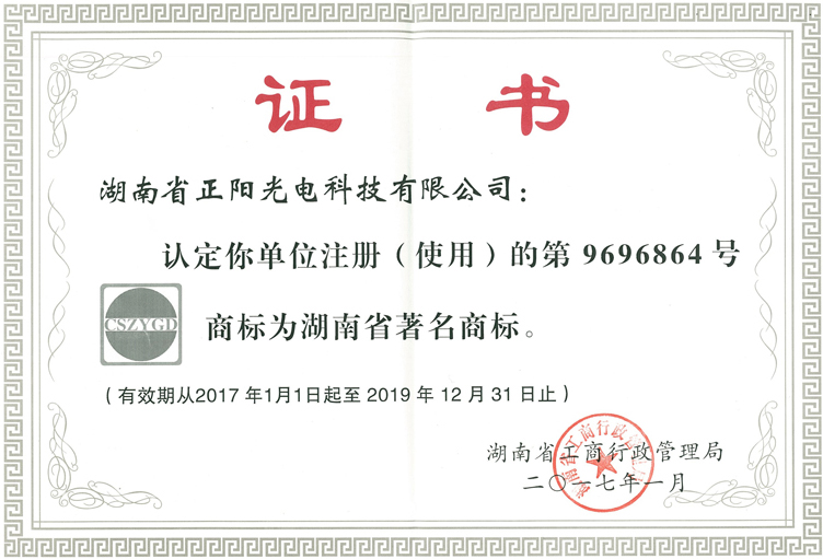 2017年2月(yuè)28日,湖南省桃花视频光電科技有限公司榮獲湖南省著名商標。熱烈祝賀我公司榮獲湖南省著名商標!
