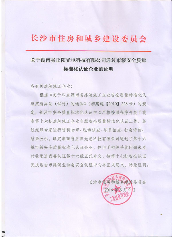 ?2016年5月24日,湖南省(shěng)桃花视频光電科技有限公司榮獲“安全質量標準化(huà)認證企業”稱號(hào)!